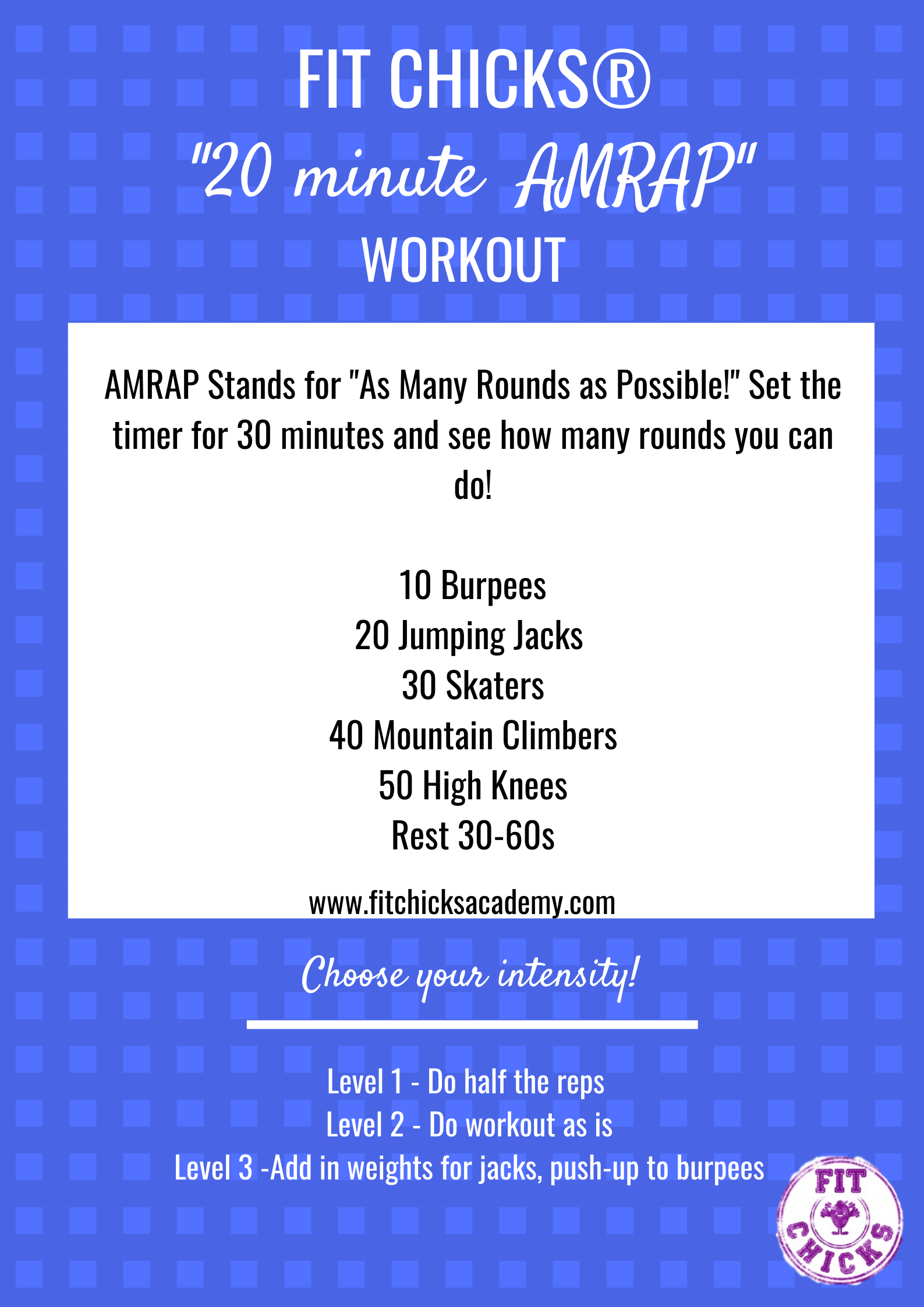 Today’s FIT CHICKS Friday workout is a 20 minute AMRAP (As Many Rounds As Possible)!! This AMRAP has a fun twist, each exercise you increase the number of reps by 10!! Don’t worry, you get a short between rounds (if needed)!! So grab a timer, set it for 20 minutes and see what you can do! Happy sweating!