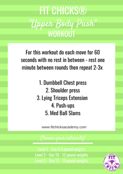 Today’s FIT CHICKS Friday workout is an Upper Body Push! That means we are working our push muscles: chest, shoulders and triceps!! Next week we will be working our Upper Body Pull muscles to keep you balanced! ๐